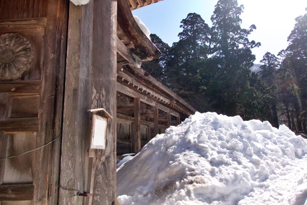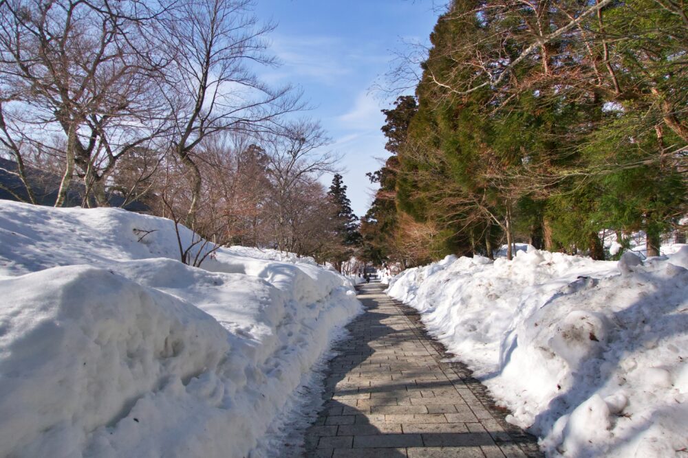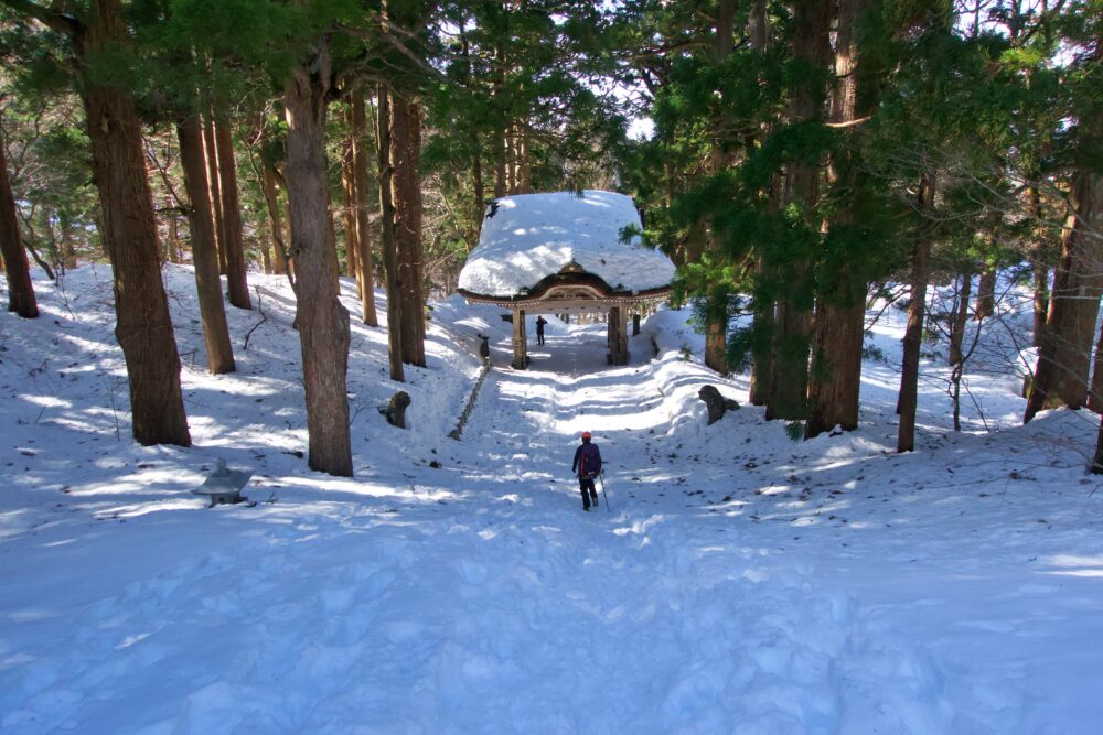 駐車場から元谷へは、大神山神社奥宮参道と行者登山口を経由し元谷へと向かいますが、夜間は路面が氷ついている場合があります。実際、この日も夜間はつるっつるでした。