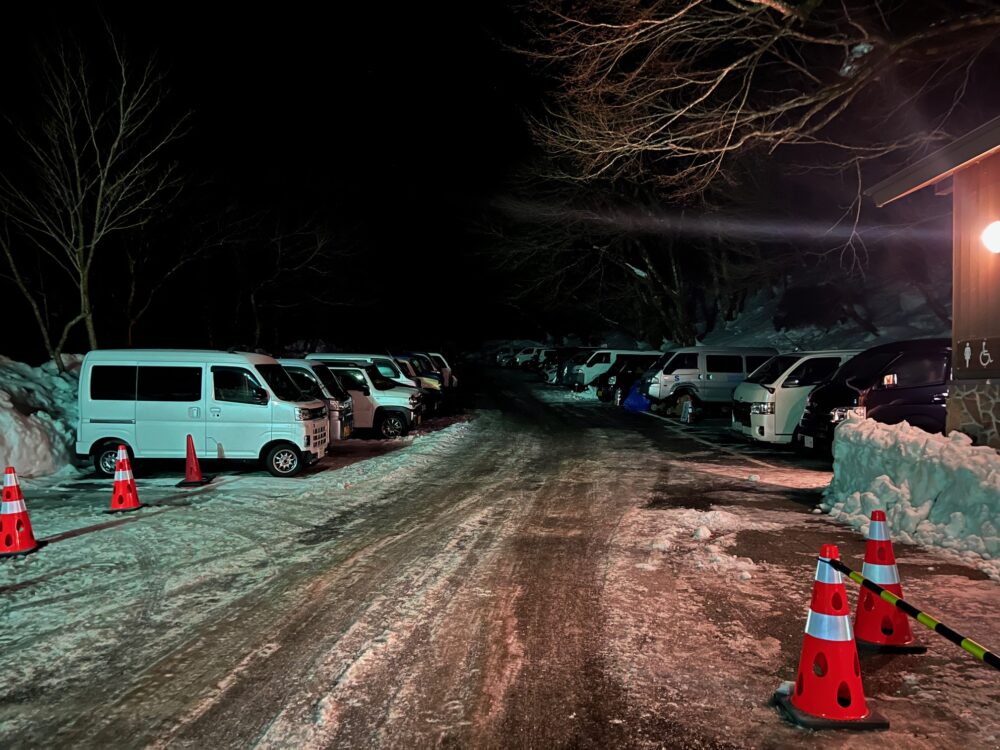 2時半に到着して、残り1枠でした。これは夏の北アルプスの駐車場レベルです。