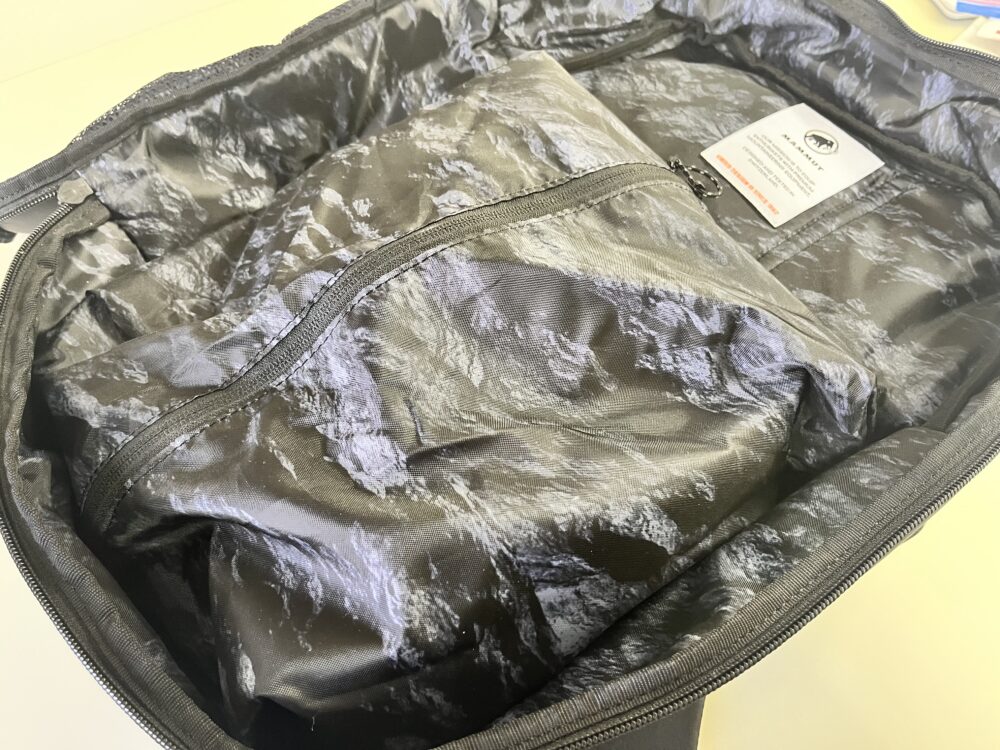 MAMMUTと分かるロゴはショルダーベルトに1箇所、表の上部にグレーでマンモスの表記があるだけと、控え目である為、よほどフォーマルを求める環境でない限りビジネス使用も問題ないでしょう。